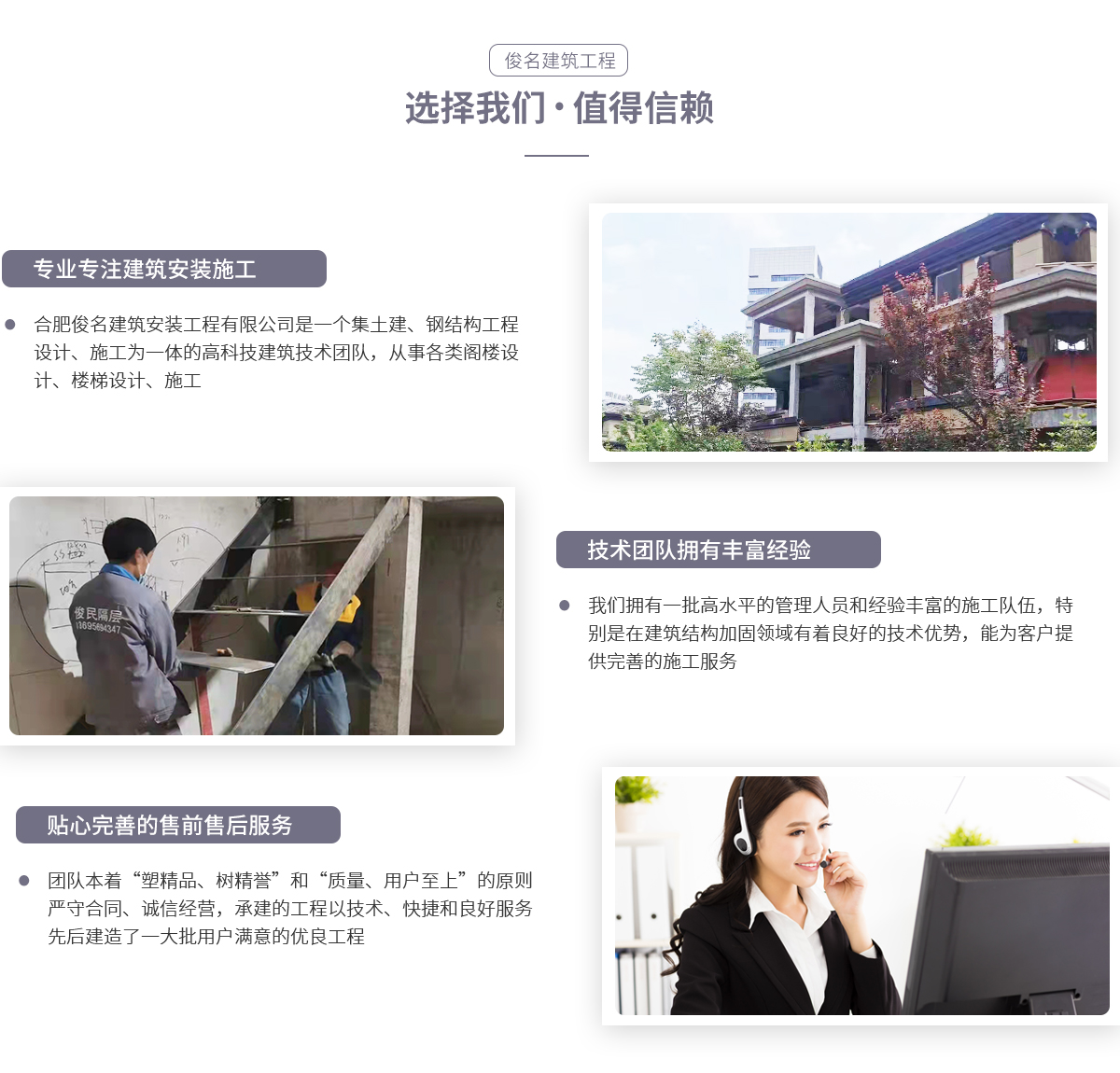 - 合肥俊名建筑安裝工程有限公司是一個集土建、鋼結(jié)構(gòu)工程設(shè)計、施工為一體的高科技建筑技術(shù)團隊,從事各類閣樓設(shè)計、施工。我們擁有一批高水平的管理人員和經(jīng)驗豐富的施工隊伍,特別是在建筑結(jié)構(gòu)加固領(lǐng)域有著良好的技術(shù)優(yōu)勢。團隊員工精誠團結(jié),以“尊重規(guī)范,拒絕平凡”為宗旨,為客戶提供完善的施工服務(wù)。團隊本著“塑精品、樹精譽”和“質(zhì)量、用戶至上”的原則,嚴守合同、誠信經(jīng)營,所...